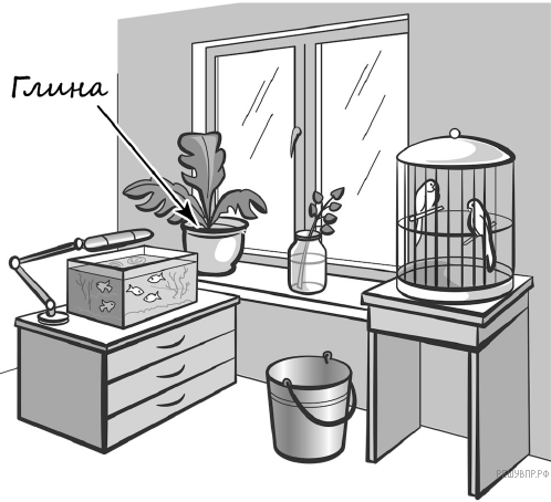 1. Рассмотри рисунок, на котором изображён живой уголок. Горшок для цветов изготовлен из глины. Он отмечен на рисунке стрелкой с соответствующей надписью.